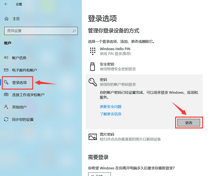 选择登录选项:在左侧菜单中,选择“登录选项”,找到“密码”,点击“更改”。