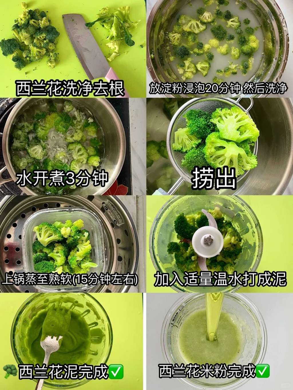 西兰花泥:富含维生素C和纤维素,有助于宝宝的免疫力。